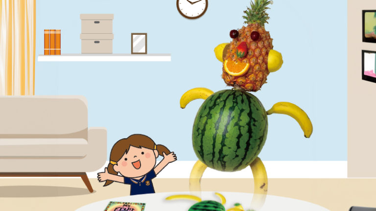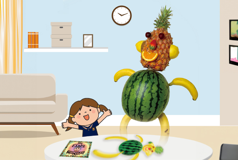 絵本「My Fruit Monster」に登場するフルーツモンスターを、八尾校A.K. ちゃんご家族が本物の果物を使って再現!