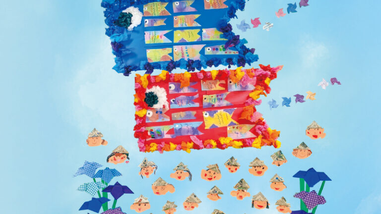 - 表紙クラフト”元気に泳ぐこいのぼりと春の空”空高く泳ぐ2 匹の大きなこいのぼりには、子どもたちの元気な気持ちが込められているようです。